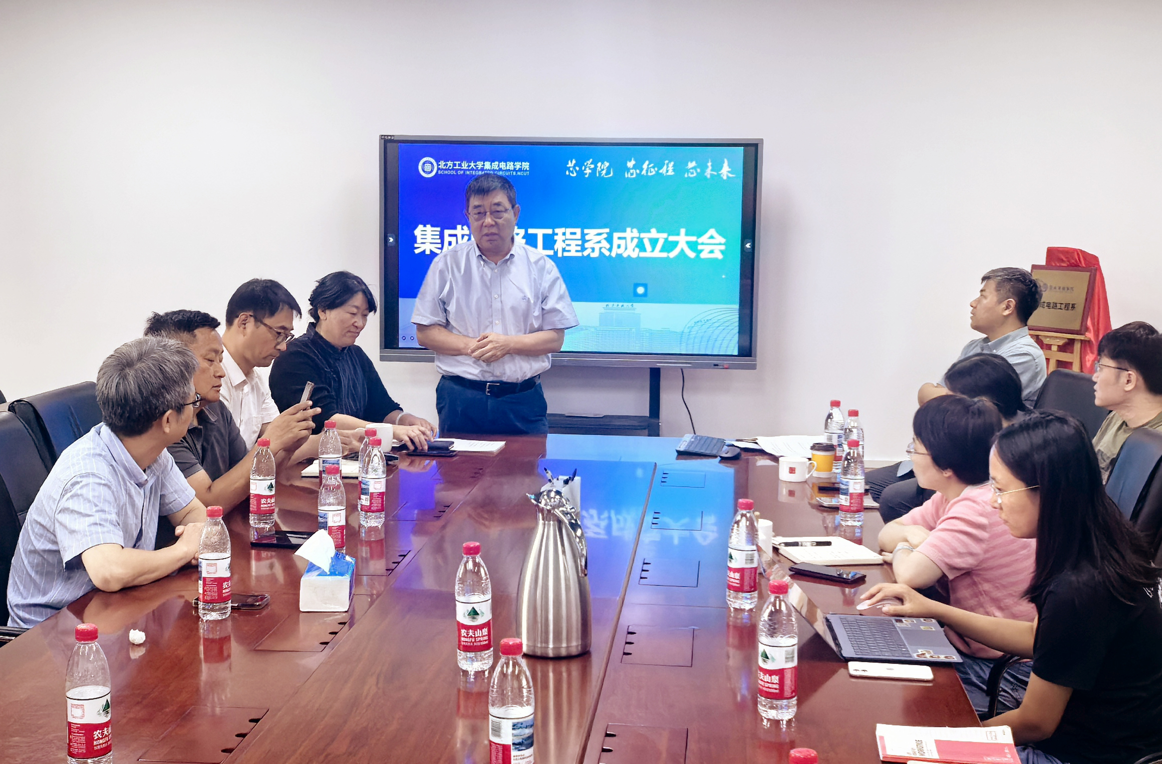 会议伊始,党总支副书记陈卫宣读了学院关于成立集成电路工程系的决定,并宣布聘任吴斌教授担任首任系主任。随后,吴斌教授发表就职讲话,围绕教学与科研两大方向,对集成电路工程系的未来发展提出设想与规划。他表示,新系将充分整合校内多学科优势资源,聚焦先进芯片设计、EDA工具及集成系统等核心领域,着力构建产教融合、协同育人的新型人才培养模式。