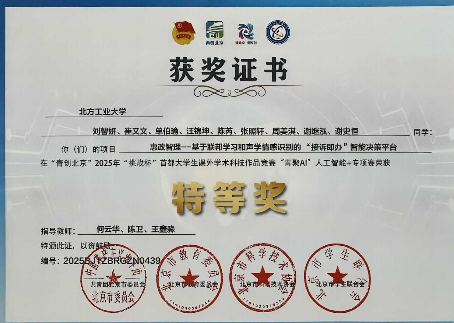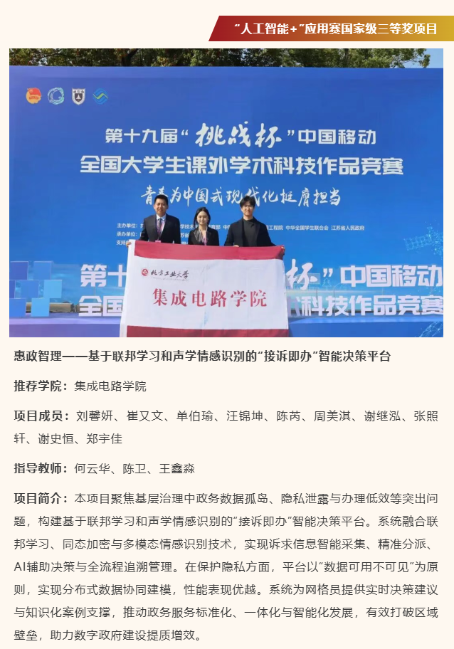 Betway必威优秀学子获得“青创北京”2025年“挑战杯”首都老员工课外学术科技作品竞赛“青聚AI”人工智能+专项赛,特等奖1项: