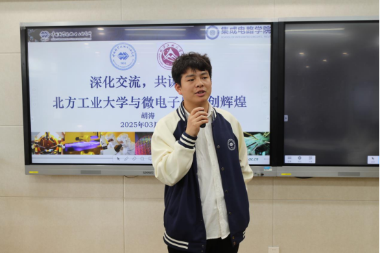 微电子所研究生会副主席胡涛展示研究所科研成果,提出联合党建与学术合作愿景。通过校史馆参观,详细了解了学校的办学历程、办学特色、办学成就,深入了解了公司校训、校风、校徽等学校文化的深刻内涵,深化两校对彼此发展历程与科技贡献的认知。